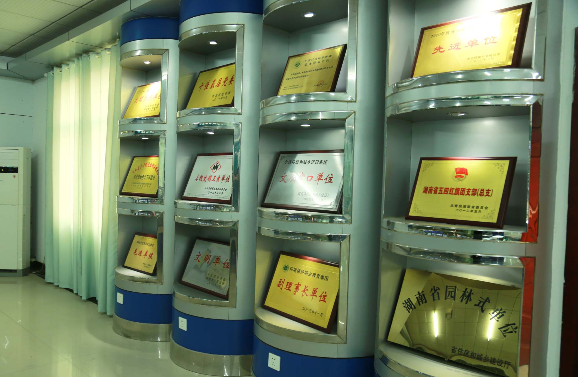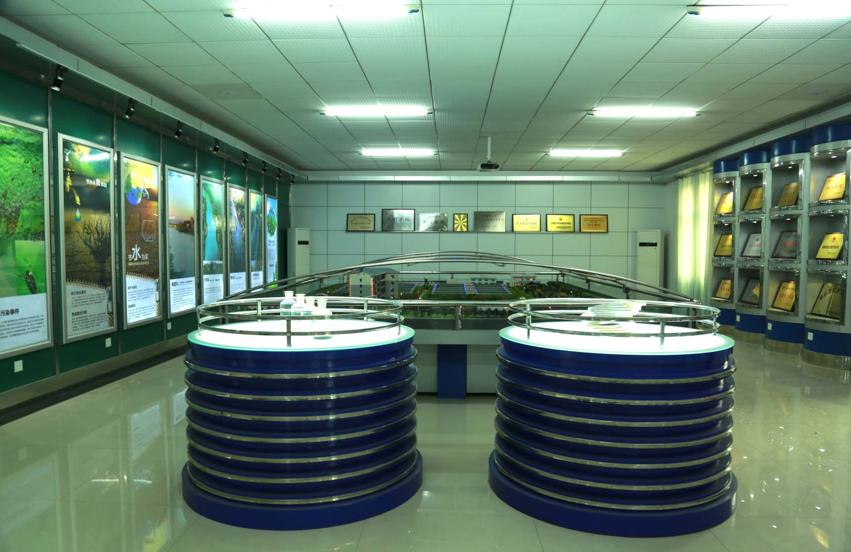 展覽廳分為四個部分,一是水環(huán)境保護的宣傳,二是平面布置實體模型,三是公司黨委歷年獲得的部分榮譽展示,四是進出水樣。